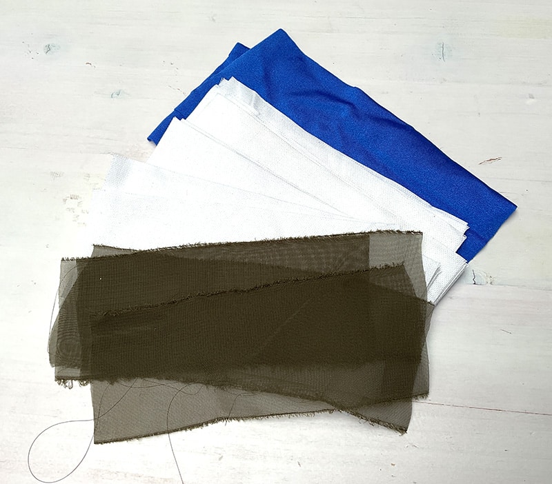 Der skal bruges minimum 16 stykker stof (lærred) på ca 15X8 cm, 4 stykke chiffon og 2 stykker meget strækbart stof