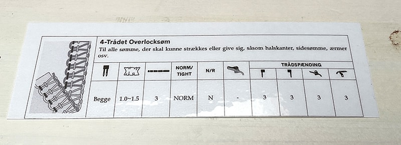 Jeg ELSKER min sømguide og selvom jeg efterhånden har en del overlock rutine, så ligger den ALTID ved siden af min overlocker, så jeg lige kan tjekke en sømindstilling, når jeg har brug for det. Der er selvfølgelig sømme jeg kan huske i hovedet – jeg ved en at ved “en fir-trådet-overlock” skal alle fire trådspændinger som udgangspunkt stå på 3, men de fleste kan jeg ikke i hovedet og det er heller ikke nødvendigt, for jeg har min sømguide 😉